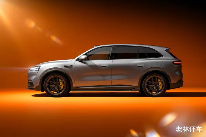 车侧部分,和问界M5十分相似,不过新车的尺寸更大,所呈现出的视觉效果也就更修长。还能看到,新车配备了双五辐式轮圈,配备了橙色刹车卡钳。根据前轮刹车卡钳靠后的位置可以判断出,它的前悬架是双叉臂,后悬架就是多连杆了。另外,新车还配备了半隐藏式门把手,对待北方地区的消费者更加友好。